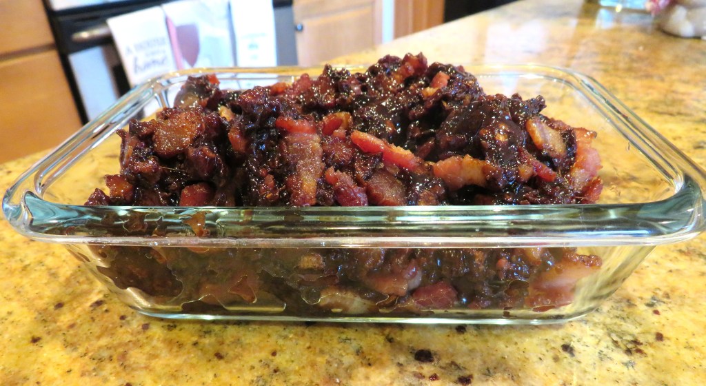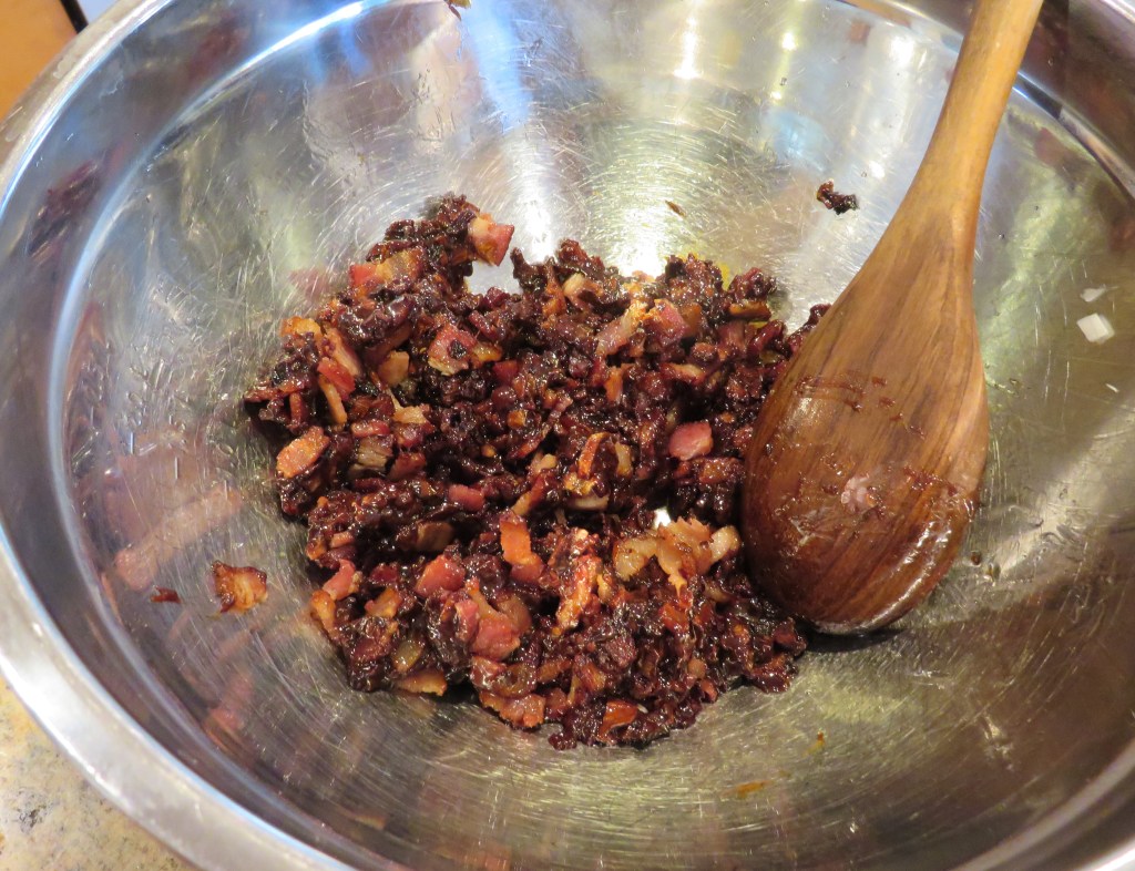Mix in the bacon and allow to cool a bit. You can use it immediately or you can refrigerate it and use it later. If you are using it later, heat it before using so it is nice and warm and not as hard and sticky.