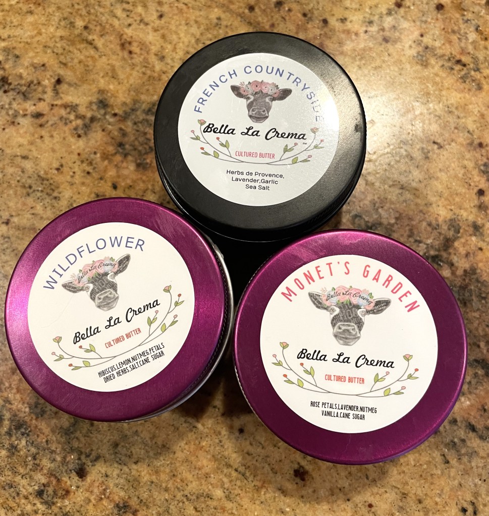 Bella La Crema is a small, unique handcrafted butter shoppe located in Longmont, CO, about 30 or so minutes north of us. Bella La Crema was born in 2018, by chef and butter lover Shauna Lee Strecker, aka Shauna Lee. Shauna has been making butter her whole life, starting at the tender age of 5, while still in kindergarten. She describes the art of making butter as a “vacuole of happiness” deep in her soul. As the owner of Bella La Crema in Longmont, Colorado, Shauna uses her years of experience to create small-batch, hand-packed artisanal butters. Shauna was once a ballerina, but now lovingly calls herself the “Prima Butterina.” I love this. 🙂
