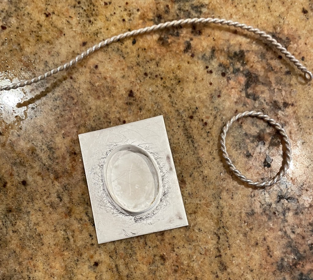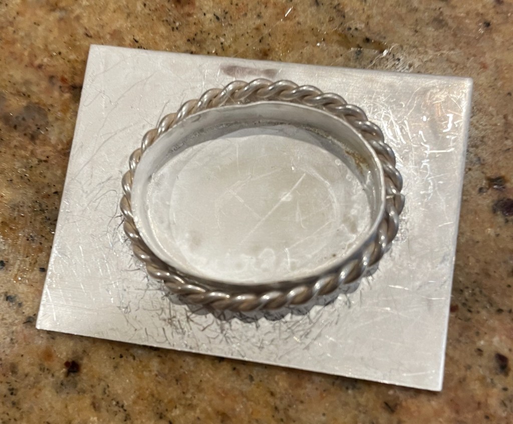 Last night was another night for my jewelry class. In this class we learned how to solder our bezels to the backing and how to make the decorative edging that will go around the bezel. It is a process, and we are all still learning, but I think it is coming along nicely. I can’t wait to see the finished piece. Soon. I just have to keep telling myself that. Then, we will move on to the next piece, which will be a bracelet.