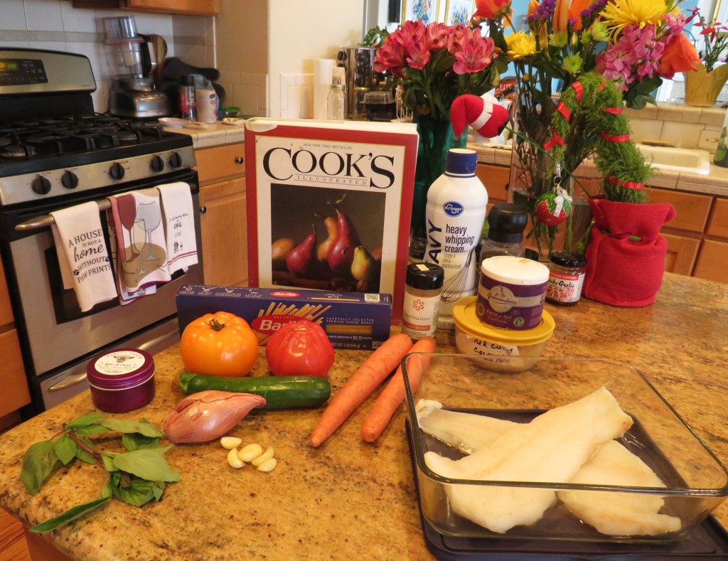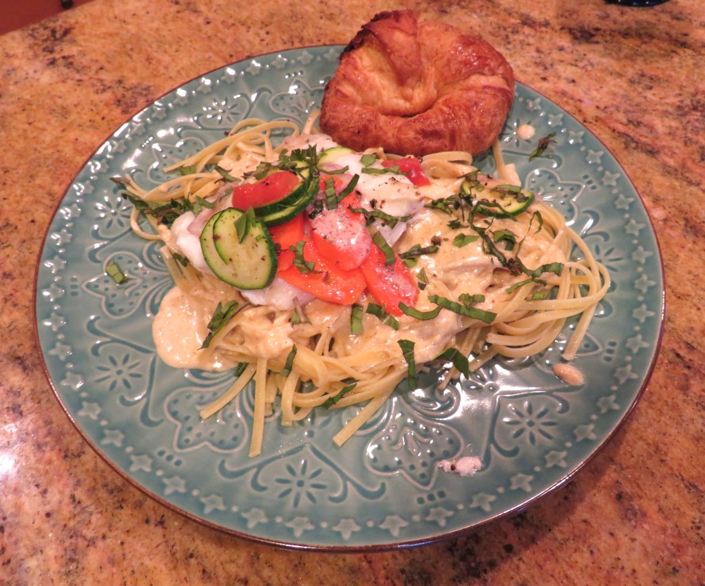 You can serve it as it with your favorite side dishes, or you can can serve it over pasta or rice. I served mine over linguini with some of my leftover red curry cream sauce and then topped it with some fresh basil. To really make the meal French, I served warmed croissants on the side, topped with more of my Monet’s Garden butter from Bella La Crema, and a glass or two of a cool, crisp dry white wine on the side.