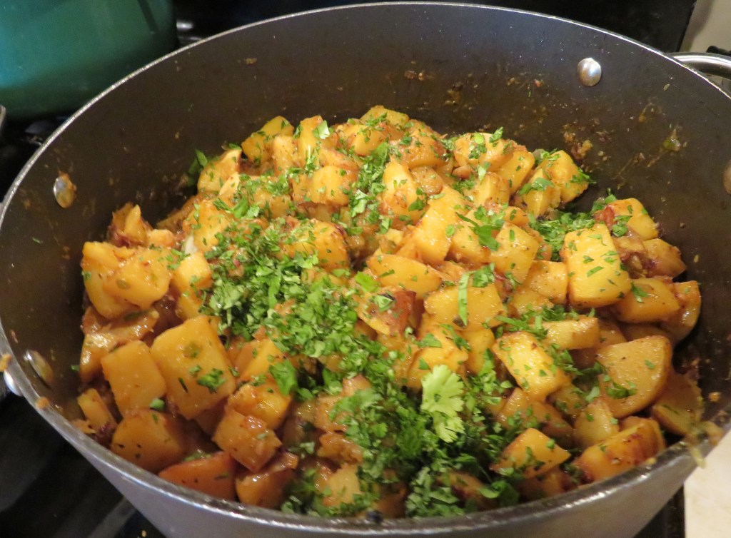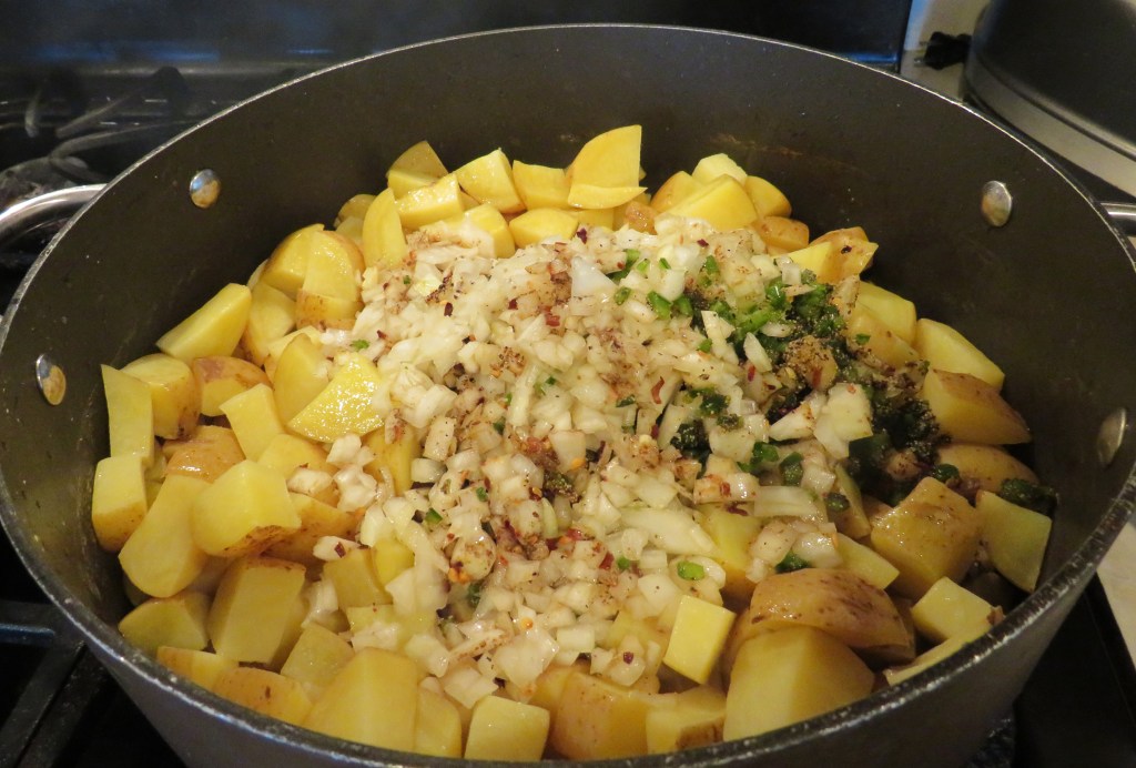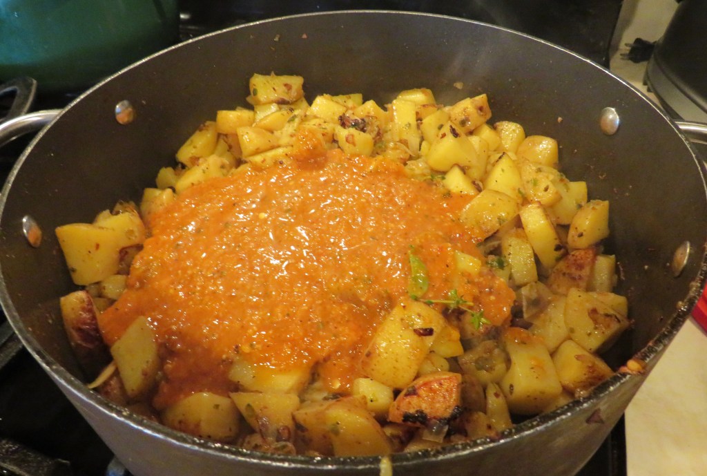 Get a large skillet or pot very hot, add the olive oil, cooked potatoes, onions, garlic and spices and cook for about 20-30 minutes, stirring occasionally. Add the tomatoes, (or salsa rojo) and mix together thoroughly. Continue to cook for about 8-10 minutes or until the tomatoes have broken down and most of the liquid has evaporated.