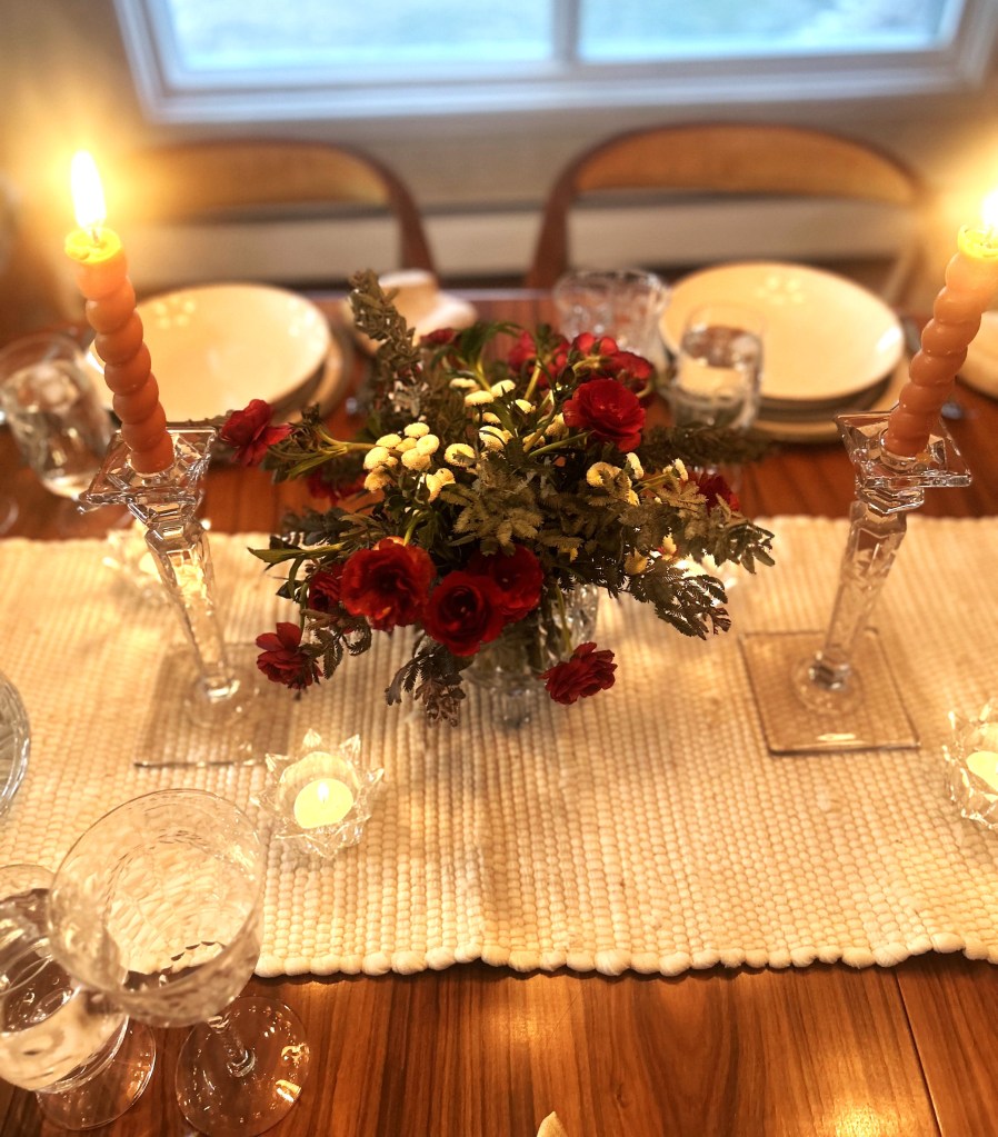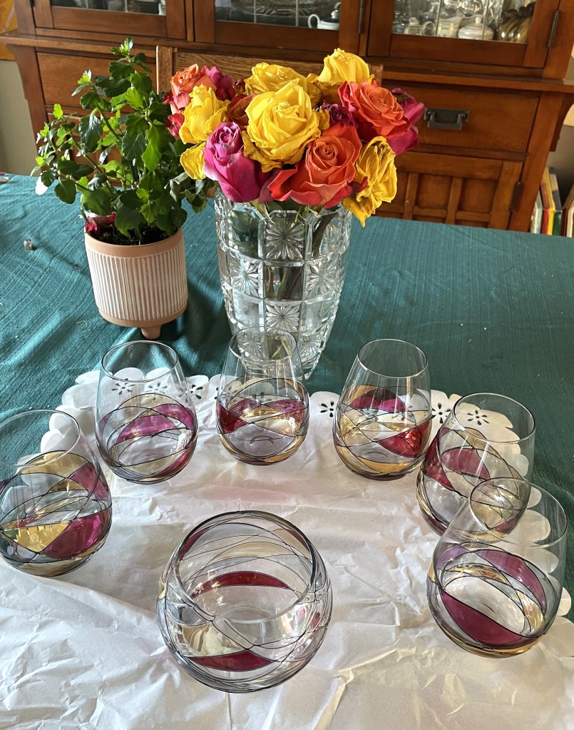 A couple of years ago, Priscilla had given me these gorgeous hand made wine glasses from Spain. I just love them. My present this year was a votive holder/flower vase that matched the wine glasses.