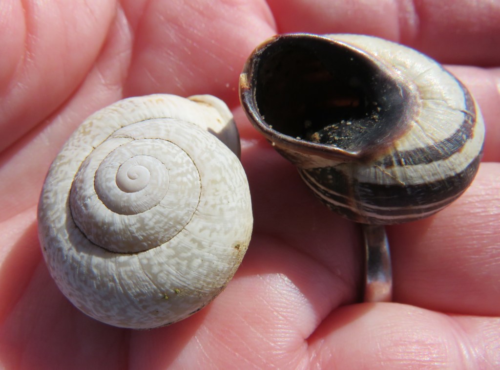We found these two perfect Nautilus type sea shells, but they still had critters inside, so we threw them back into their home, and back to the sea they went.