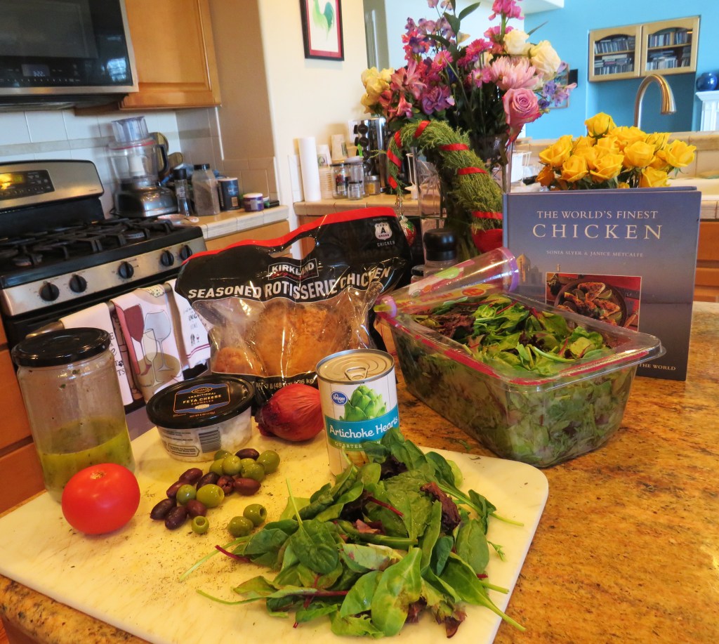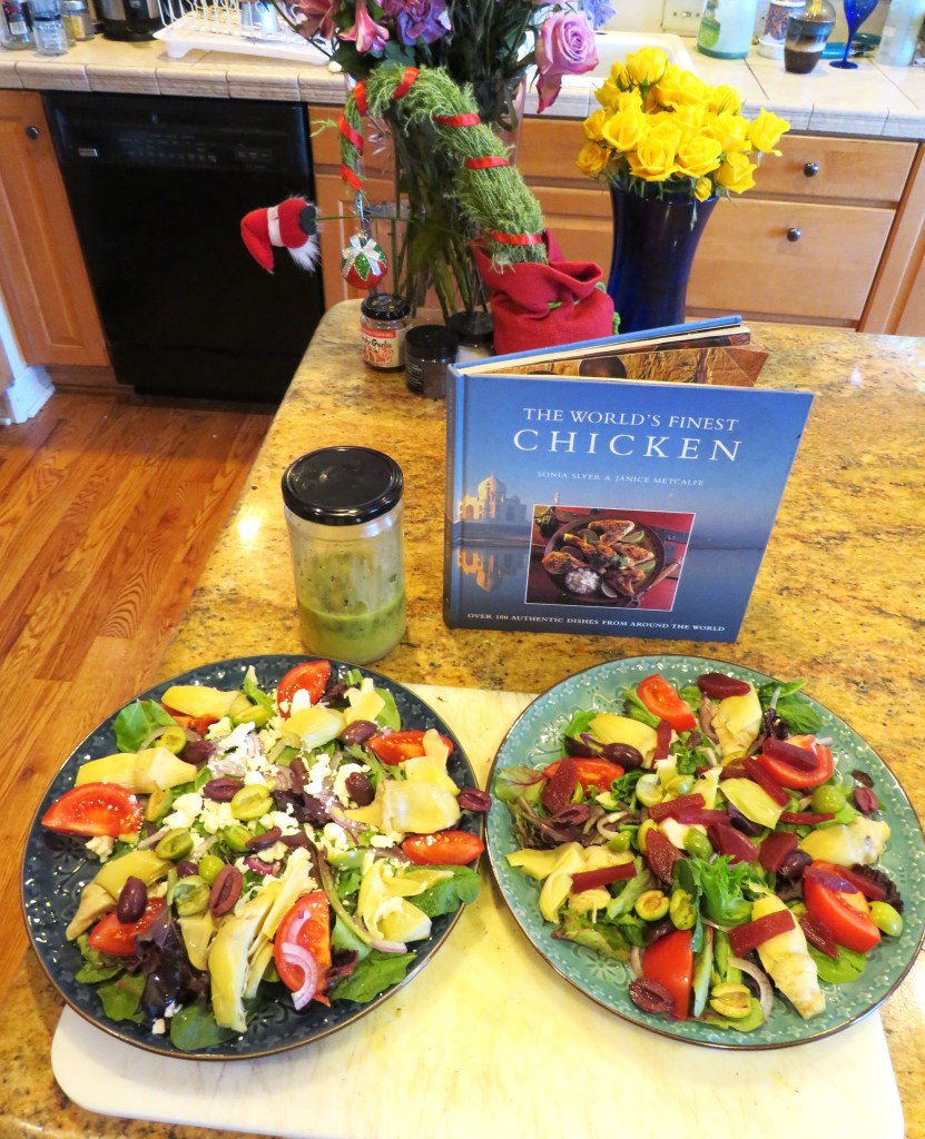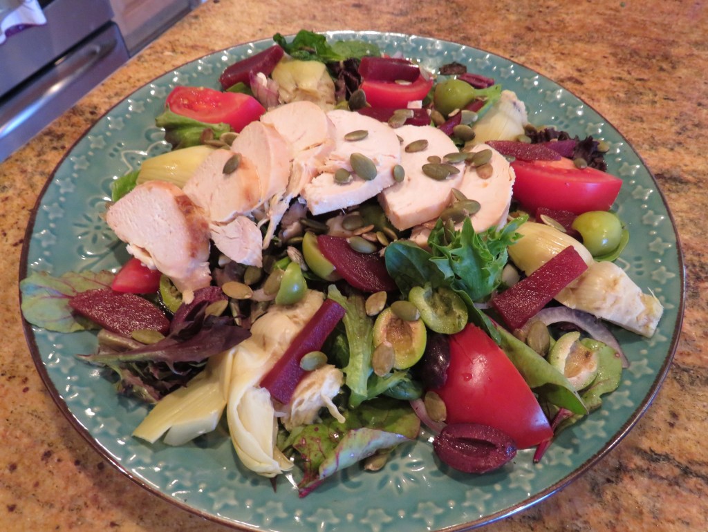 On one of our very warm days, I made another delicious Mediterranean salad. This one was loaded with chicken, olives, artichoke hearts and much more.