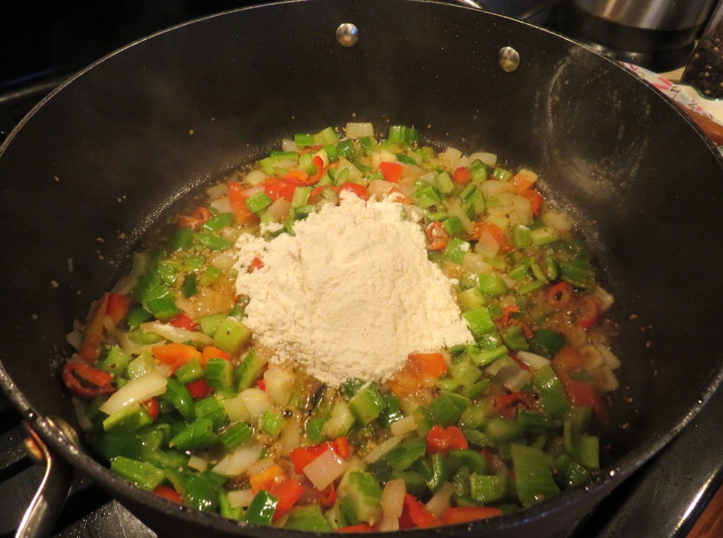 After the vegetables have softened a bit, add the flour and incorporate well into the mixture. The amount of time you cook the flour will determine the color and intensity of the roux. The longer you cook it, the darker it will become, and the more intense the nutty flavor. This is purely a personal choice depending on how you like it. There is no right or wrong way.