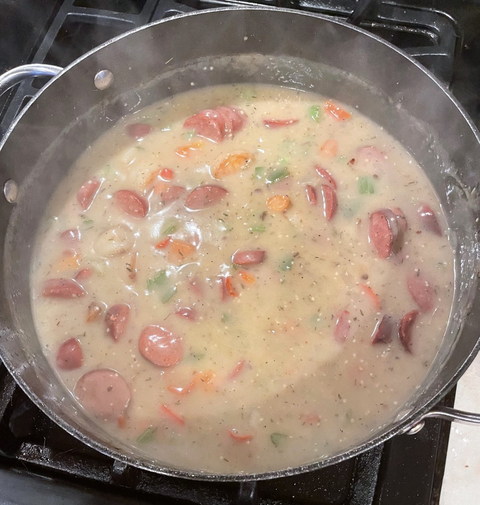 Once the roux is to the color and intensity you desire, add the chicken broth and seasonings and mix together well. Bring to a boil.