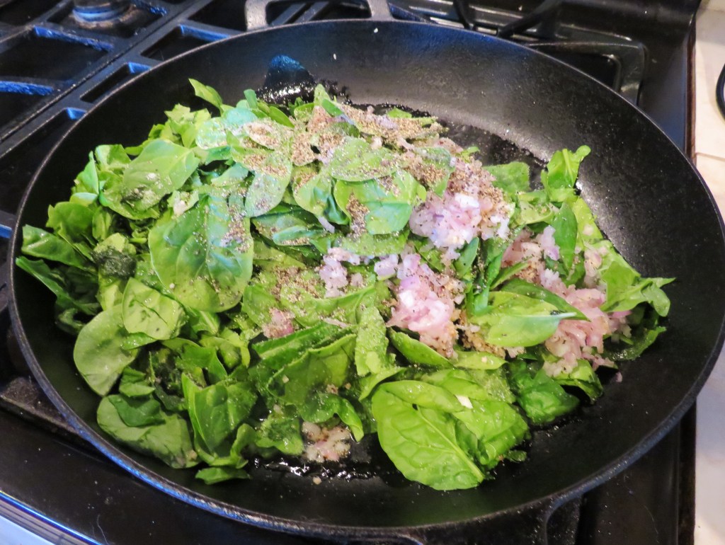 Cook the spinach, shallots, garlic and seasonings in a hot skillet with olive oil for about 5 minutes, stirring constantly.