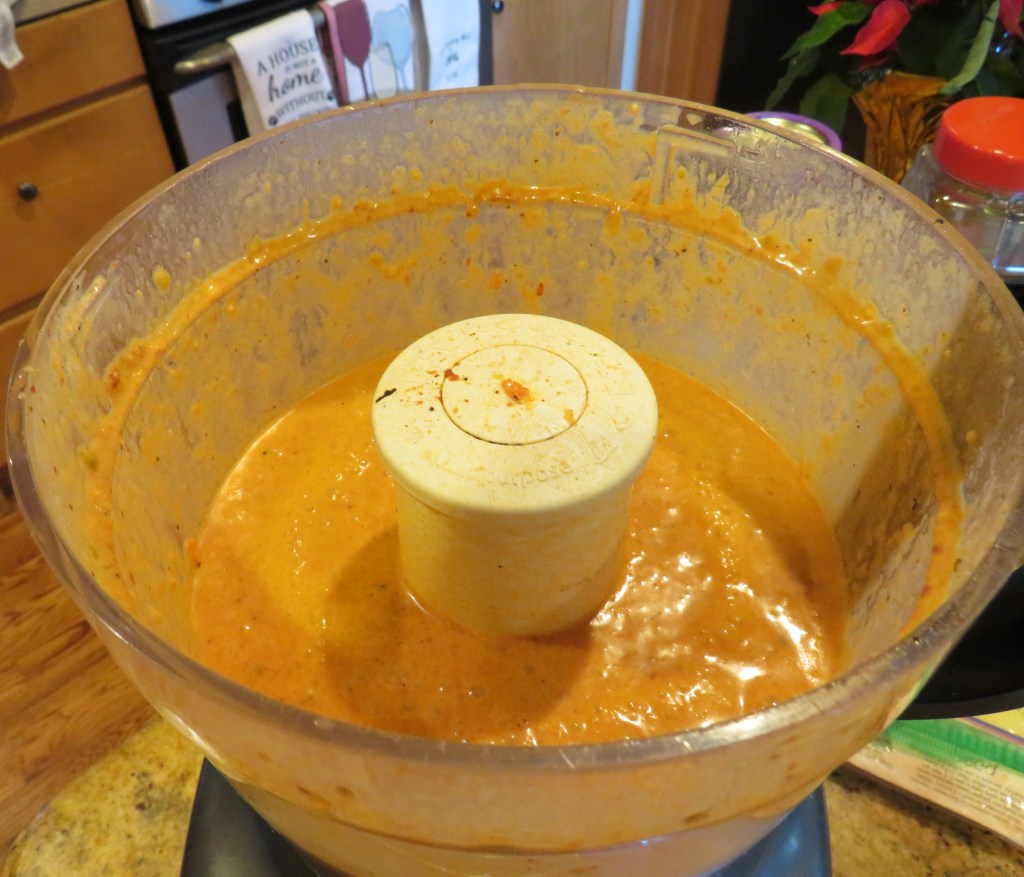 Once the vegetables are roasted, allow them to cool a bit. Split the jalapeno and remove the charred skin and the seeds. Place the tomatoes and the jalapeno in a food processor along with all the spices, herbs, garlic, cream and chicken broth and process until it becomes a smooth liquid.