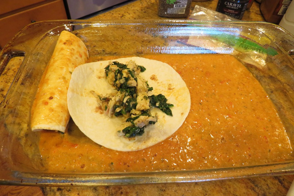 Add a little sauce to the bottom of the prepared baking dish and spread evenly. Heat the tortillas just long enough to make them pliable, then dip in a little sauce, fill with the filling and roll. Repeat until all the tortillas are filled. Pack them in tightly together.