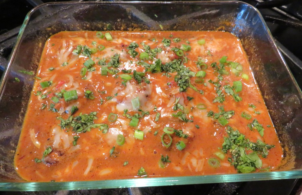 Add a generous amount of sauce on top, then cover with the cheese you are using. Cover with aluminum foil and bake for about 30-40 minutes, or until the internal temperature gets to about 160-165*F, the cheese is completely melted, and the tortillas are nice and soft.
