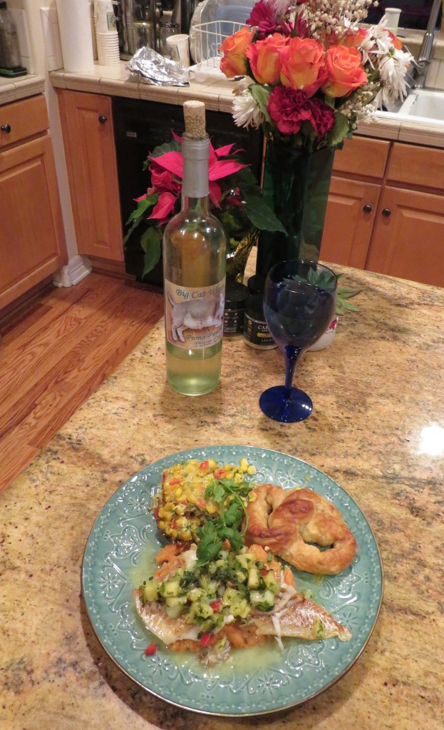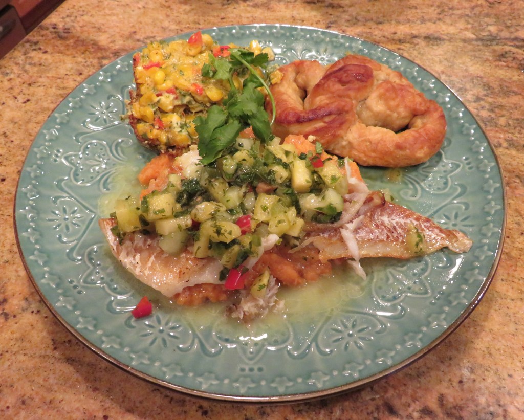 I placed the cooked cod on top of a bed of pureed sweet potatoes, then added some of the lime aioli on top, and finished it with a generous dollop or two of my pineapple cucumber salsa. I finished the dish with some corn pudding and the last of my New Year’s pretzels Keeping Our New YearβsΒ Traditions and served it with a chilled Pinot Grigio on the side (one of ours, that we made). !Delicioso!