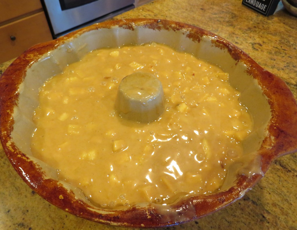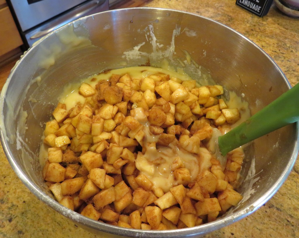 Gently fold the apples into the batter, then spoon into the prepared pan and spread evenly.