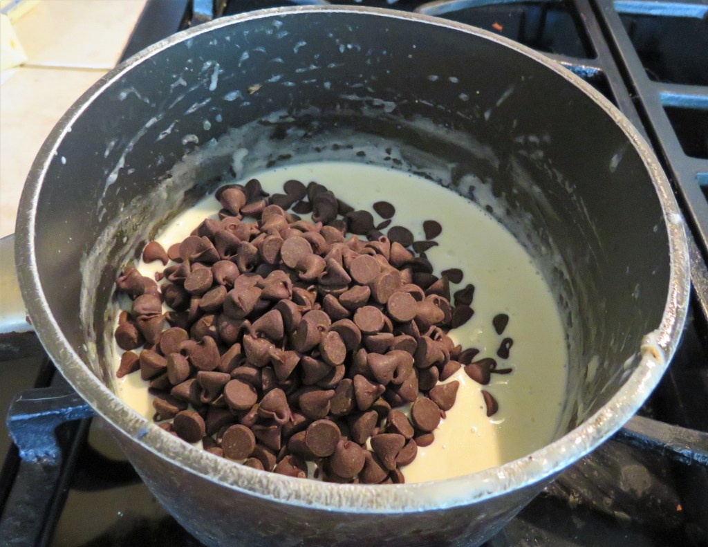 Add 1/2 of the chocolate morsels and again, gently stir into the mixture. Cook until all the chocolate is completely melted and you have a smooth, creamy mixture.