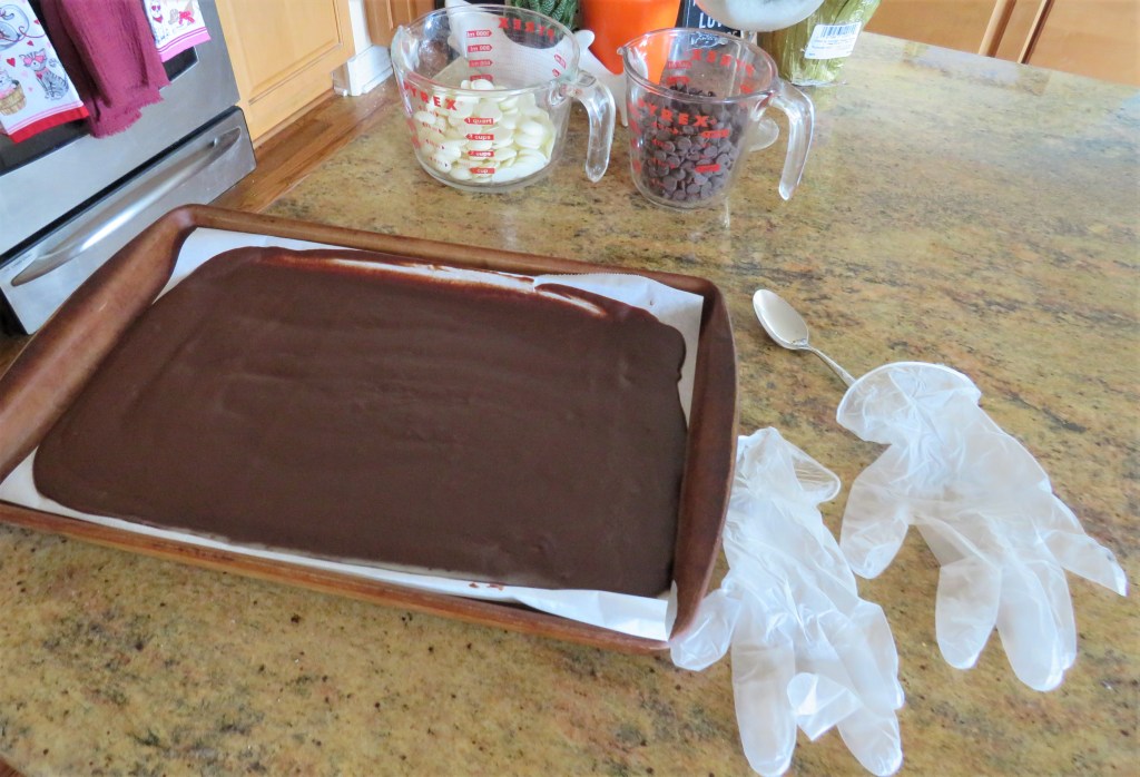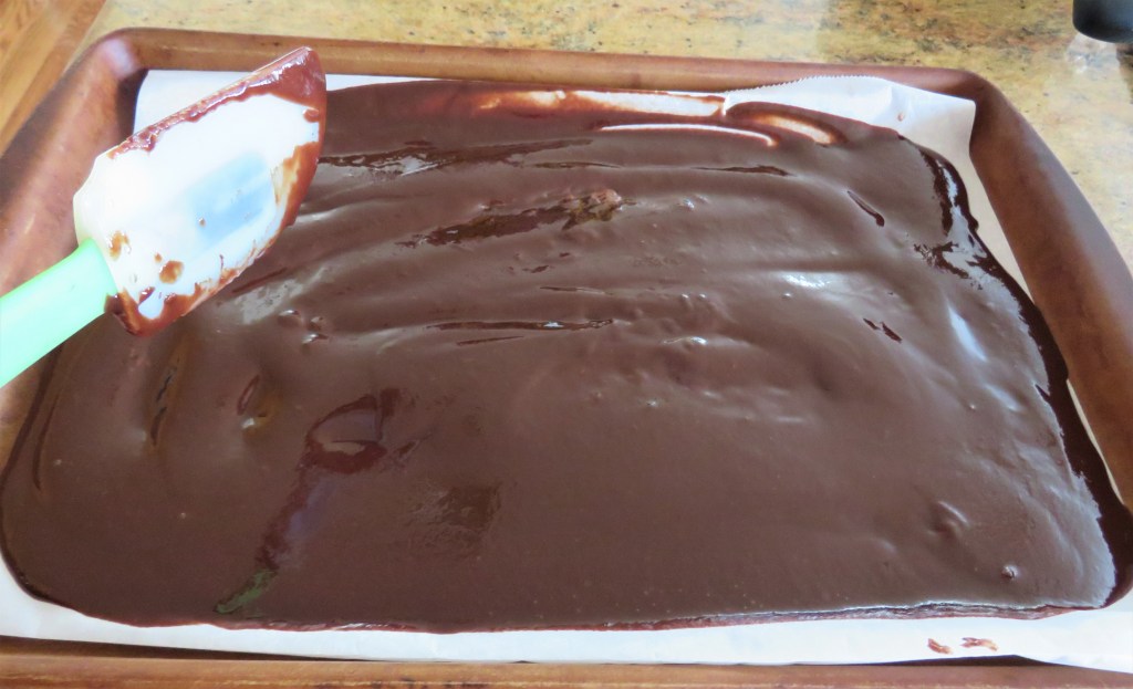 Place parchment paper onto baking sheet then carefully pour the chocolate mixture onto parchment paper and evenly spread into a thin layer to fill the pan.