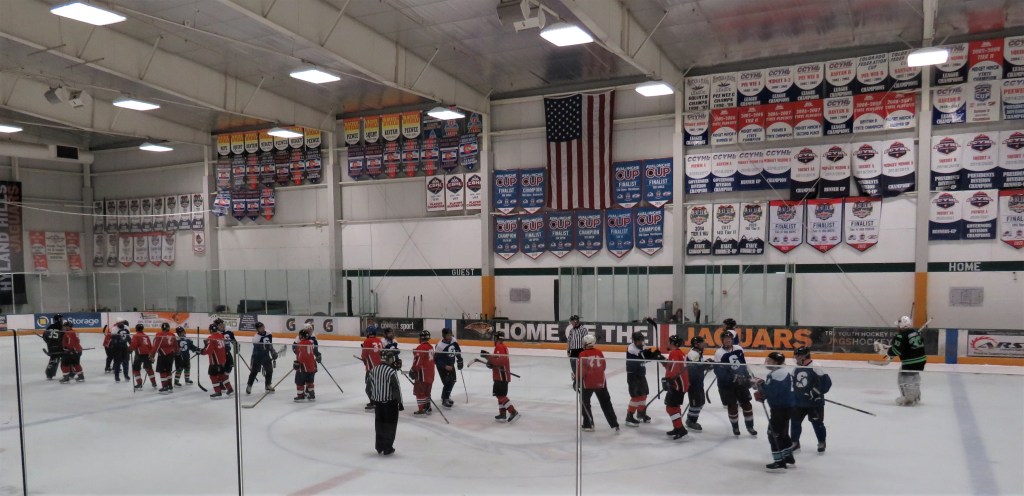They put up a good fight, and it was a fun time and a good game, but The Slapshots still lost, 5-3. I always love seeing this at the end of every game. Win or lose, both teams do a skate-by and congratulate each other on a game well played.