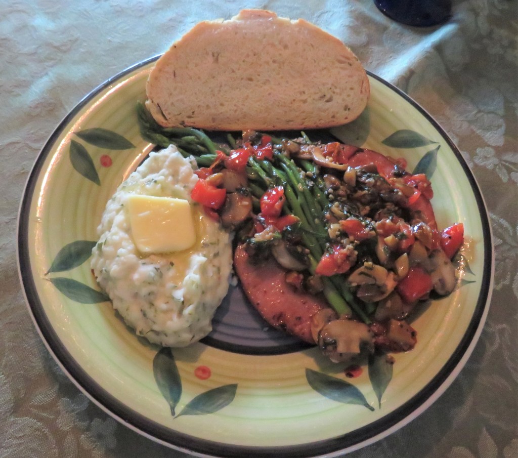 We had some chili in the freezer that we took down, and I served the chili over a baked potato with his delicious cheesy onion bread on the side, along with a glass or two of a rich, full-bodied red wine. I think it was a cab. It was a perfect way to warm up on a cold, chilly night, or should I say “chili” night. π