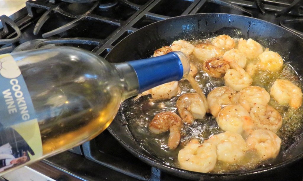 Get a skillet nice and hot and add your oil(s). Then add the shrimp and the red pepper flakes and cook until the shrimp are done and are nice and pink all around, about 7-8 minutes. Then add the wine and continue to cook for about 2-3 more minutes, or until the liquid is reduced to about half.