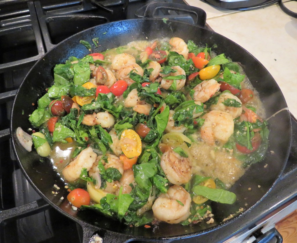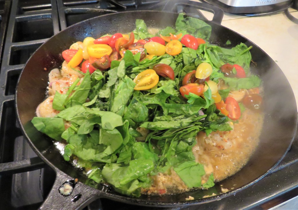 Add the garlic, shallots, spinach or greens and tomatoes and cook just long enough for the spinach to get wilted. to make it even more springy, I used a combination of tomatoes. I like the variety and color that they add.