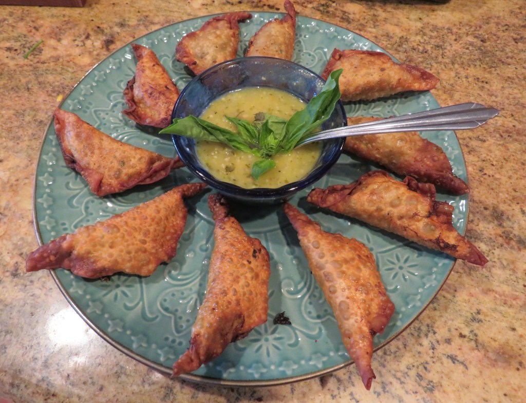 We just had a simple dinner of light tapas, with these fried wontons and some fresh shrimp ceviche. Sometimes, light fare and tapas are all we want.
