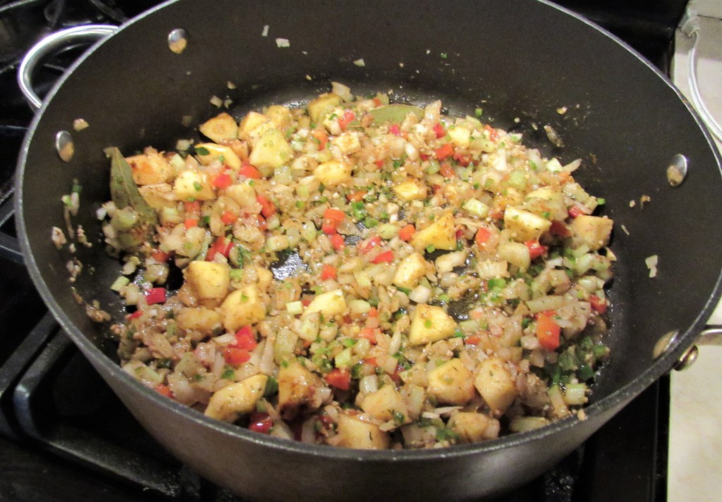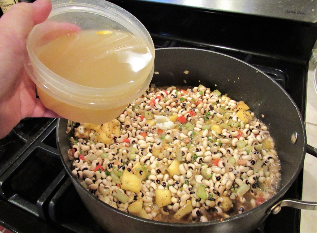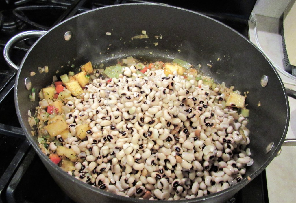 I cut my chicken into thin strips and mixed it with the rice and black-eyed peas. I diced the rest of my vegetables and sauteed them in olive oil for 7 minutes, then combined them with the rice and chicken.
