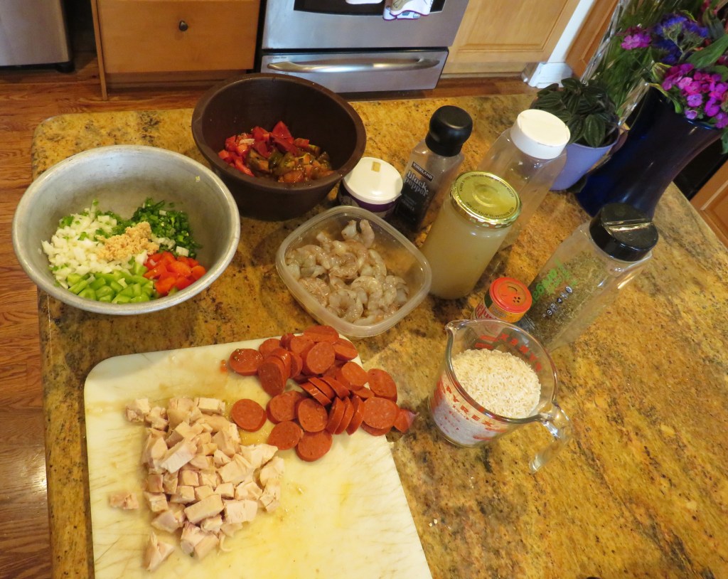 I used fresh tomatoes, red and green bell peppers, onion, jalapenos, garlic, chicken broth, shrimp, andouille sausage, chicken and rice. Any thoughts? Again, it could be any one of the three above mentioned recipes.