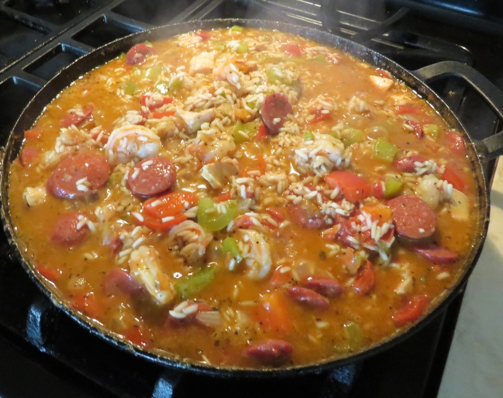 Jambalaya is a hearty and flavorful rice dish that holds a significant place in Louisiana cuisine. It’s a one-pot meal that developed from a blend of Spanish, French, and African influences, incorporating meat (like sausage, chicken, or pork), seafood (shrimp or crawfish are common), vegetables (the “Holy Trinity” of onion, celery, and bell pepper being a core element), and spices. There are two versions, the Cajun and the Creole. My version was the Creole version because I added tomatoes. The Cajun version doesn’t use tomatoes. Originating in New Orleans, this style includes tomatoes (fresh or canned) in the dish, giving it a reddish hue. Creole jambalaya is often associated with the broader access to ingredients found in the city and can sometimes be a bit “soupier” due to the added moisture from the tomatoes. Cajun jambalaya is more popular in the rural areas of Louisiana and their bayous. Cajun jambalaya is often simpler and more rustic, sometimes featuring game meats and a different spice blend than Creole versions.